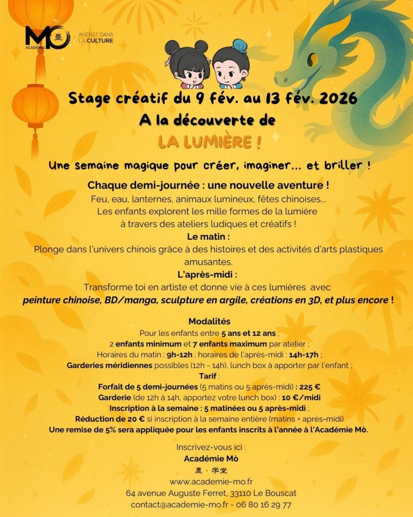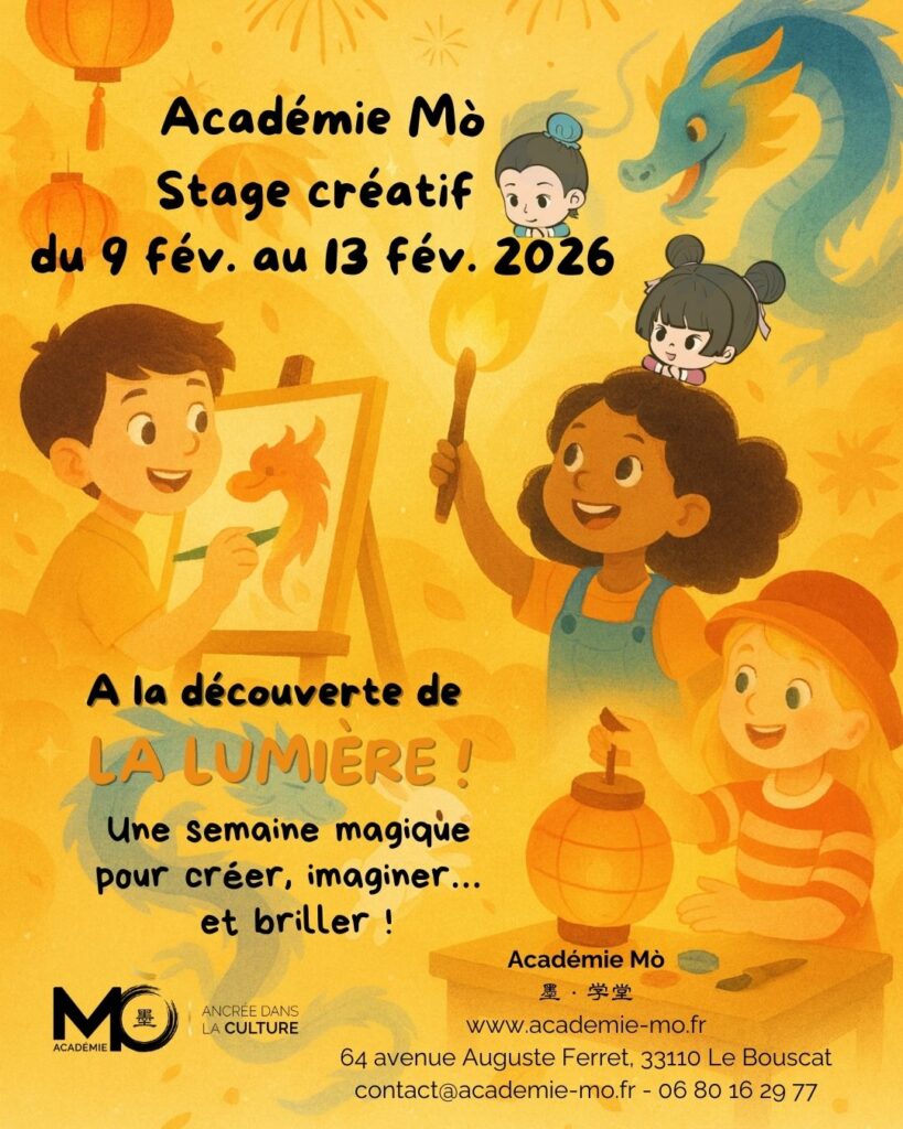 Pendant 5 jours, du 9 au 13 février 2026, l’Académie Mò invite les enfants de 5 à 12 ans à explorer la beauté de la lumière à travers la culture chinoise.