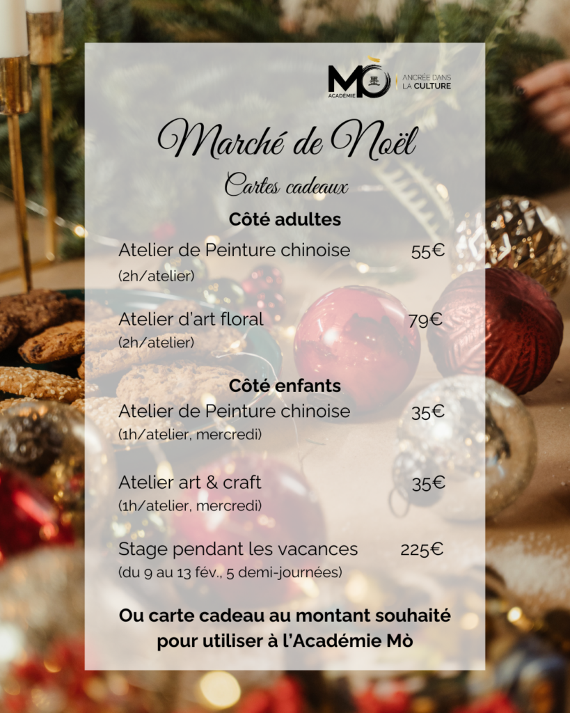 À l’occasion de Noël, l’Académie Mò vous propose des cartes cadeaux à offrir aux enfants comme aux adultes, pour vivre une expérience artistique et culturelle unique autour de la culture chinoise.