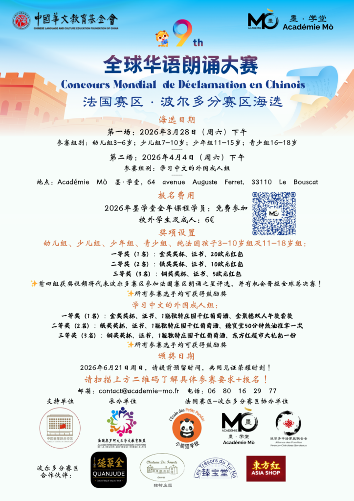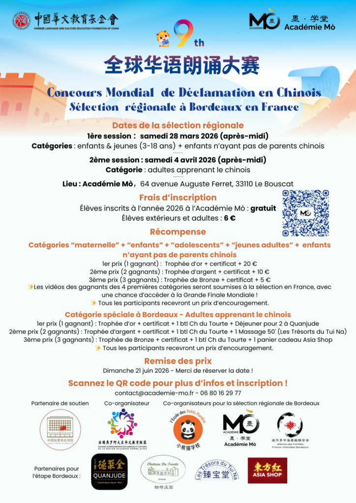 La sélection régionale à Bordeaux est organisée par Académie Mò, et s’adresse aux enfants, adolescents et adultes apprenant le chinois.